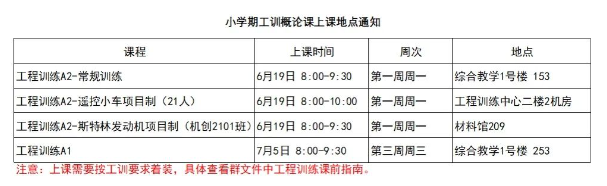 工训第一节课为概论课,上课时间及地点如下,请各位同学按照工训要求着装到指定地点上课,概论课后统一集合到工训中心。