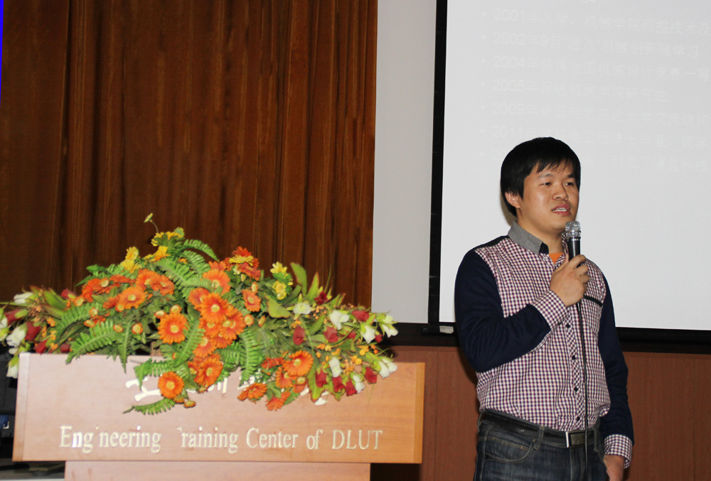 讲座伊始,工程训练中心主任、工程训练中心党支部书记梁延德教授为大家隆重介绍了主讲人----孙灵俊。他是我校机械创新班的第一批学员,2004年凭借“机械式停水自闭水龙头”获全国大学生机械设计竞赛一等奖,是大连理工大学本、硕、博毕业生,根正苗红“大工人”。博士毕业后,进入英特尔任工程师。工作三年,辞职创业,成立了大连新谦益科技有限公司。2015年9月获得李克强总理接见,获赠创业金钥匙,并获得50万元的天使投资。