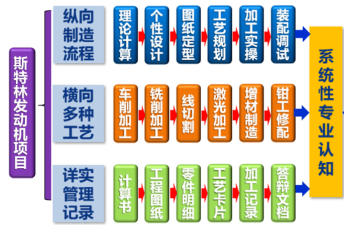“斯特林发动机模型”的制造,需要将理论计算、结构设计、图纸绘制、工艺规划、加工实操和安装调试等实际生产环节串联;需要从车、铣、线切割、激光加工和3D打印等多种加工技术中合理选择加工手段;需要根据工况合理安排,有效地将松散的工训模块相互结合。