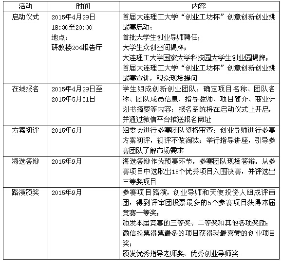 首届大连理工大学“创业工坊杯”创意创新创业挑战赛由大连理工大学创新实验学院、共青团大连理工大学委员会、大连理工大学教务处、大连理工大学招生就业处、大连创业工坊联合主办,是面向大连理工大学全体在校生的创意、创新、创业竞赛。该竞赛的目的是发现和培养一批有创造力、有创业激情的团队,引导和扶持一批有创新性、有市场前景的项目,激发学生创造力,鼓励创新实践,培养学生的创业意识和创业能力,营造我校大学生创新创业氛围,进一步完善人才培养路径。