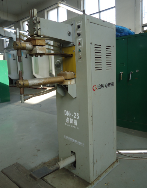 图5 DN1-25点焊机 | 型号:DN1-25 输入电源电压:380V 额定容量:25KVA 额定频率:50HZ 负载持续率:20% 调节级数:7 焊接时间:0~2s 焊件厚度:3+3 生产厂家:金科电焊机 出厂时间:2008年2月 |