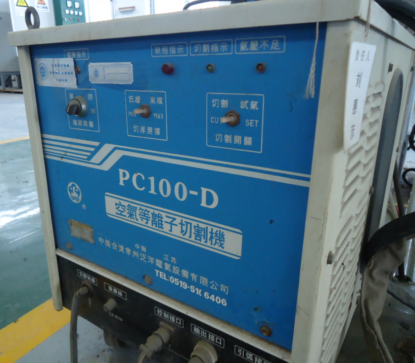 图12 空气等离子切割机 | 型号:泛洋牌PC100-D 额定输入电压:380V 三相 频率:50/60HZ 暂载率:60% 割圆直径:1000mm 最大切割厚度:40mm 重量:174kg 外形尺寸:800x1170x1330 生产厂家:常州泛洋电器设备公司 出厂时间:2000年 |